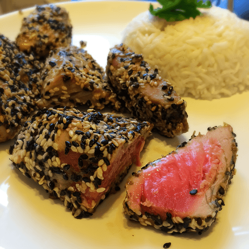Стейк из тунца в кунжутной панировке — это изысканное блюдо паназиатской кухни, объединяющее в себе нежность свежего тунца и аромат хрустящего кунжута. Идея панировки в кунжуте пришла из азиатских кулинарных традиций, где ценят гармонию текстур и вкусов. Маринад на основе соевого соуса и рисового уксуса добавляет утончённую кисло-сладкую нотку, подчеркивая естественный вкус рыбы. При правильной обжарке тунец остаётся розовым внутри, сохраняя свою сочность, а снаружи покрывается золотистой кунжутной корочкой. Это блюдо идеально подходит как для легкого ужина, так и для праздничного стола, особенно в сочетании со свежими овощами или пикантным соусом. Такой стейк — не просто еда, а настоящее гастрономическое искусство, пробуждающее вкусовые рецепторы и дарящее удовольствие с каждым кусочком.