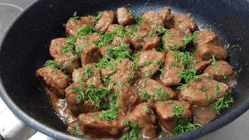 Порезанный лук добавить к мясу. Добить молотый перец и гранатовый соус. Жарить, мешая, чтобы соус хорошо впитался в мясо.