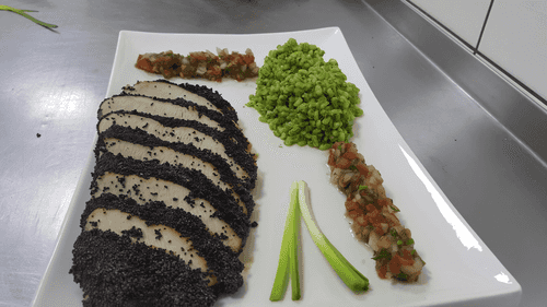 Филе индейки в медово-маковой панировке — это изысканное блюдо европейской кухни, сочетающее нежность мяса и тонкую сладость меда с хрустящей текстурой мака. Истоки такого приготовления уходят в традиции западной гастрономии, где карамелизированные панировки ценятся за богатство вкуса. Имбирный маринад придает филе пикантную остроту, а смесь оливкового и кунжутного масла усиливает аромат. Запеченное в духовке мясо остается сочным, а маковая корочка создаёт утонченное хрустящее покрытие. Блюдо идеально подходит для торжественных ужинов и семейных встреч. В качестве гарнира предлагается перловка с соусом песто и сальса, которые добавляют свежесть и контраст текстур. Это сочетание делает филе индейки не только вкусным, но и эстетично привлекательным на тарелке.
