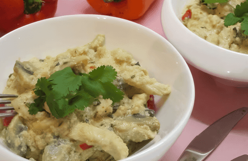 Разогреть растительное масло и на нём обжарить перец в течении 5-6 минут. К обжаренному перцу добавить куриное филе и шампиньоны. Жарить всё вместе 12-15 минут.