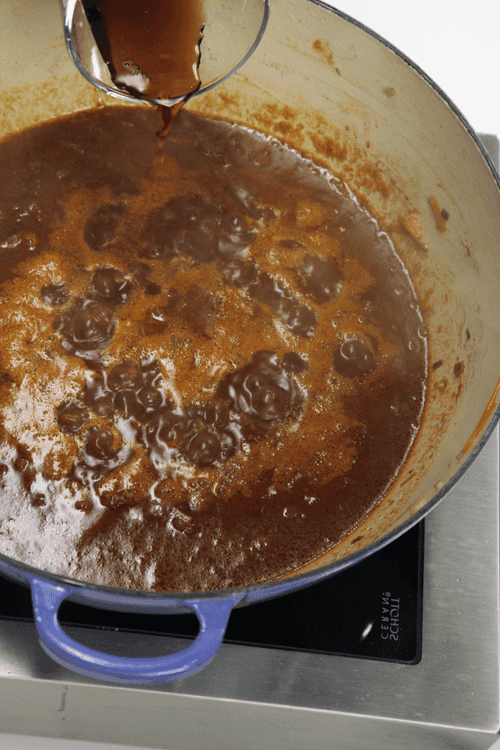 Затем к овощам добавить говядину и готовить до появления «вкусного мясного запаха». Далее добавить томаты и тушить около 10 минут, периодически помешивая. Попробовать, если гуща слишком кислая, добавить немного сахара. Залить все пивом и тушить на минимальном огне около двух часов.