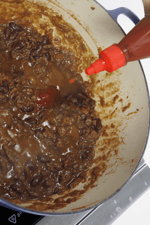 Добавить соус шрирача, фасоль и тушить еще около 10-15 минут. Выключить огонь и дать отдохнуть еще около часа.