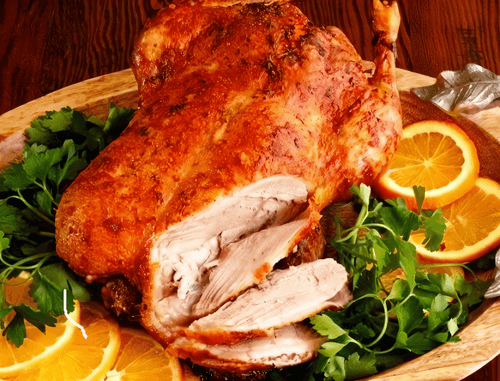 Когда утка зажарится, облить ее подготовленным бульоном.