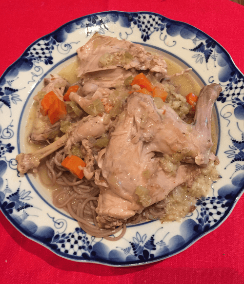 В том же сотейнике (не моем, кладем в то же масло с соком от кролика) припускаем овощи: поэтапно закладываем – а) нарезанную крупным кубиком морковь (обжариваем со всех сторон, помешивая, до золотистого румянца), б) шинкованый мелко репчатый лук – пару больших луковиц (продолжаем жарить, помешивая, до прозрачности лука), в) мелко порубленный стебель сельдерея (жарим всё еще минут пять). Перед окончанием обжаривания солим, перчим, добавляем травяные приправы. ПРИМЕЧАНИЕ: все то же самое можно делать в двух сковородках — в одной (поглубже, с высокими бортиками; я беру большой сотейник) обжаривать кролика, в другой овощи, потом соединить в той, где кролик.
