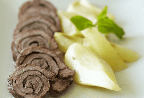 Мясной рулет с фруктами — изысканное блюдо европейской кухни, сочетающее нежность мяса с освежающей кисло-сладкой ноткой персиков и груш. Это гармония вкусов, где мягкая говяжья лопатка, пропитанная ароматами базилика и мяты, становится идеальной основой для фруктового соуса с белым вином и белым перцем. Такая комбинация придает блюду изысканность и благородство, делая его не просто мясным угощением, а настоящим гастрономическим удовольствием. История подобных рулетов восходит к старинным европейским традициям, где мясо часто дополнялось фруктами для придания ему сочности и глубины вкуса. Подавать этот рулет лучше с легкими салатами или запеченными овощами, а белое сухое вино подчеркнет его богатый аромат. Идеальный выбор для праздничного ужина или романтического вечера.