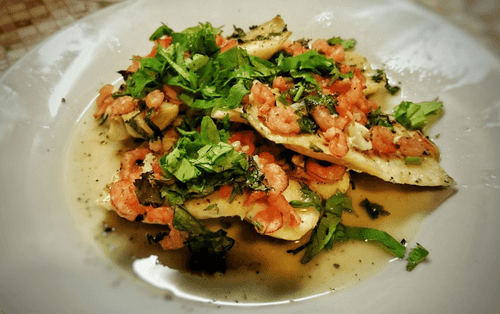 Запеченное филе трески с креветками и чесноком