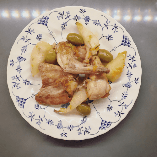 За 10 минут до готовности кролика, добавьте к нему оливки, а за 5 минут — груши.