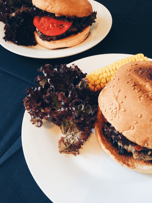 Собираем все по порядку: булочка, лук, котлета с сыром, томаты, лист салата, вторая часть булочки с 2 ложками домашнего томатного соуса.
