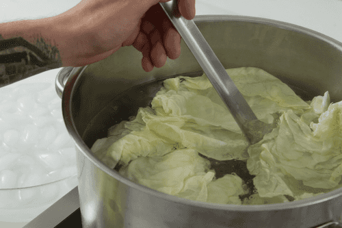Капусту разобрать на листы, бланшировать в течение одной минуты, чтобы капуста стала мягкая, остудить.