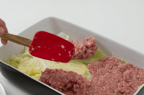 В форму для запекания выложить слоями молодую капусту и фарш из индейки. Капусту смазывать слегка взбитым яйцом. Залить 80 мл грибного бульона и запечь. Сначала под фольгой 25 минут при температуре 180 градусов, затем без фольги 20 минут при 170 и остудить.