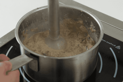 Пока запекается мильфей, приготовить грибной соус. Нарезать белый лук кубиком, произвольно нарезать 200 г шампиньонов и 60 г белых грибов. Обжарить лук, добавить шампиньоны и белые грибы, все обжарить добавить грибной бульон, томить в течение 30 минут на маленьком огне, добавить 60 г сливок, довести до кипения, пробить блендером, протереть через сито.