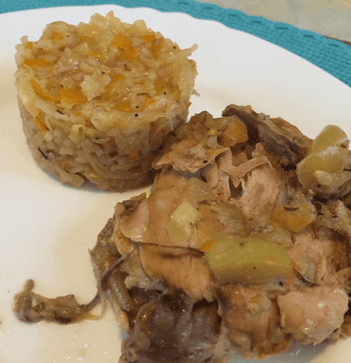Промываем тем временем полстакана риса. Когда капуста дойдёт – добавляем рис и хорошо перемешиваем. Накрываем крышкой и продолжаем тушить. Если нужно – добавляем воды, чтоб не было сухо и не сгорело. Когда от сварится – дел в шляпе! Можем кормить, дав постоять минут 15.
