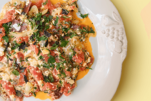 В течении 10 минут на среднем огне потушить зелень и помидоры в сковороде со сливочным маслом.