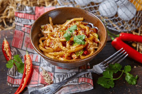 Удон с цыпленком от Chicken Run — это истинное олицетворение паназиатской кухни, сочетающей насыщенные вкусы и ароматные ингредиенты. Лапша удон, с ее бархатистой текстурой, обжаривается с нежной курицей и свежими овощами, создавая идеальный баланс сочности и хрусткости. Устричный и соевый соусы добавляют блюду глубину вкуса, а чесночное и кунжутное масла придают ему аппетитный восточный аромат. Завершающий штрих — свежий салат Айсберг, кинза и кунжут, которые привносят нотки свежести и легкости. Это блюдо идеально подходит как для уютного ужина, так и для праздничного стола, радуя как гурманов, так и любителей изысканной кухни.