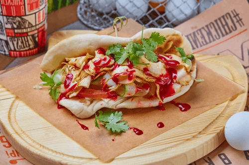 Пита с пастрами из курицы от Chicken Run — это вдохновленный мексиканской кухней шедевр, соединяющий нежную пастрому из курицы с хрустящими овощами и ароматным соусом. Корни блюда можно найти в традициях уличной еды, где питу наполняют насыщенными и контрастными вкусами. Барбекю-соус придаёт дымность, малиновый соус — легкую кислинку, а кинза завершает композицию свежими травяными нотами. Идеально подходит как легкий перекус или сытный обед, питу удобно брать с собой, наслаждаясь ею на ходу. Хрустящая лепёшка, обжаренная до золотистого цвета, становится идеальным обрамлением для сочных ингредиентов. Блюдо не только вкусное, но и эстетически привлекательное, украшая стол своими яркими цветами и аппетитной текстурой.