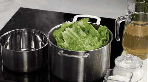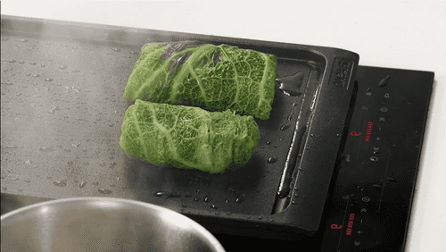 Снять верхние листья савойской капусты и ошпарить их в подсоленной кипящей воде в течение минуты. Затем выложить на лед.