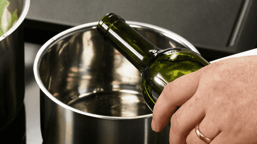 В чистый сотейник влить вино выпарить на три четверти, и добавить бульон, продолжать готовить на низком огне.