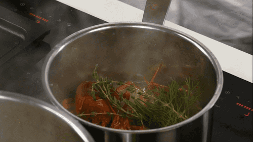 Остальные части раков отправить в соус к бульону и вину, туда же добавить тимьян, укроп и черный перец горошком. Продолжить уваривать на небольшом огне.