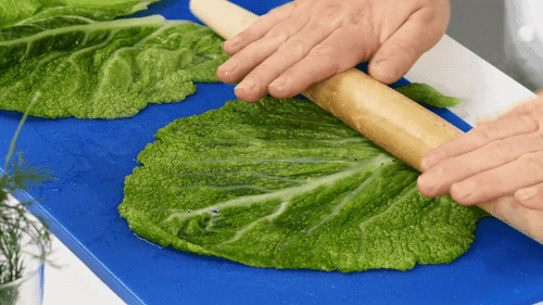 У капустных листьев вырезать хорду — твердую часть. При помощи скалки слегка раскатать листы.