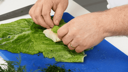 Из филе вырезать красивые ровные кусочки. На листы насыпать немного укропа, выложить треску, посолить, поперчить и завернуть