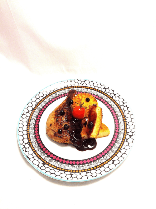 Выложить утку на тарелку, гарнировать крокетами и полить соусом. Для украшения использовал свежую чернику и помидоры черри.