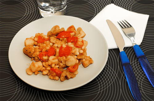 К фасоли добавить грибы, гребешки и помидоры и тщательно все перемешать.