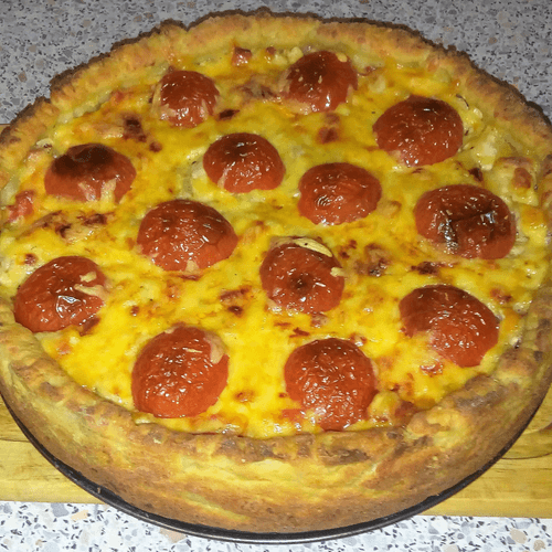 Выложить начинку на тесто, разложить половинки помидор, посыпать сыром. Отправить в разогретую до 200 градусов духовку примерно на 50-60 минут.