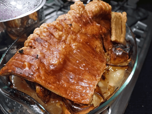 Растереть в ступке хорошую щепотку морской соли, перец и столовую ложку семян фенхеля. Втереть специи с небольшим количеством оливкового масла, попадая в разрезы в шкурке. Жарить в течение 1,5 часов.
