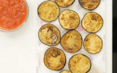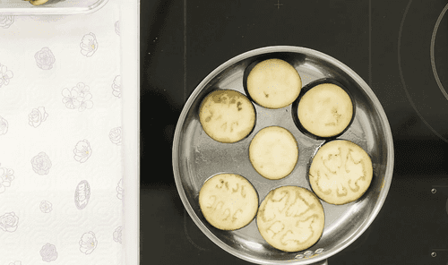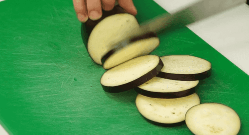 Баклажаны нарезать пластинками толщиной 5-7 мм.