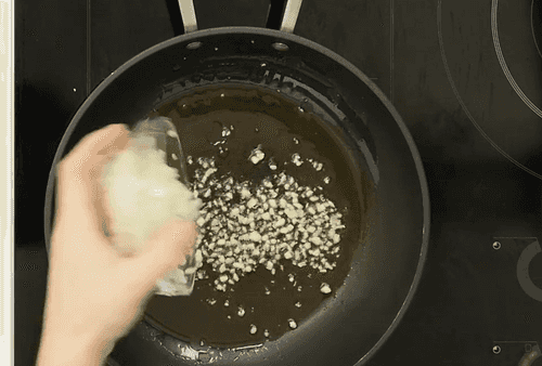 В большом сотейнике нагреть масло и обжарить мелко нарезанные лук и чеснок.