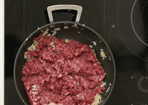 Добавить фарш и готовить его до коричневого цвета. Добавить помидоры и специи и готовить на низкой температуре, пока жидкость не испарится.