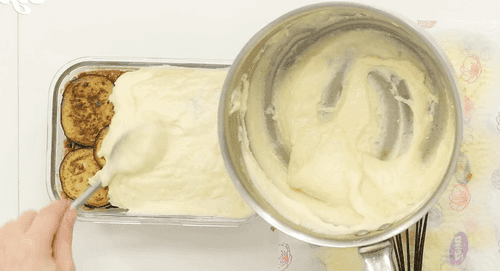 В форму для запекания выложить треть жареных баклажанов внахлест, сверху выложить половину мясного соуса, снова выложить баклажаны, опять фарш, завершить последней третью баклажанов.