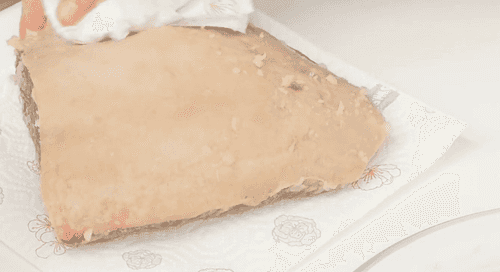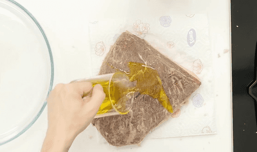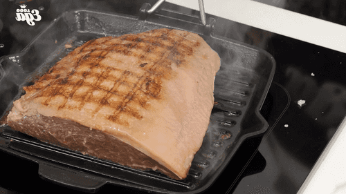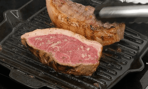 Быстро обжарить мясо на сковороде гриль с каждой стороны до румяной корочки.