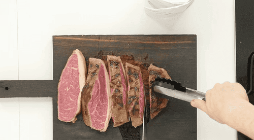 Обжаренный кусок мяса нарезать на толстые стейки.