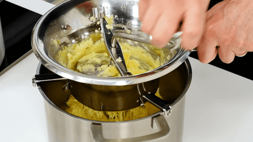 Вначале приготовить картофельную массу. Для этого очищенный картофель сварить, обсушить, протереть горячим.