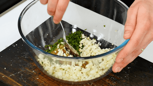 Для фарша репчатый лук нарезать соломкой, пассеровать и соединить с рубленными яйцами, нарезанной зеленью петрушки, солью и молотым перцем.