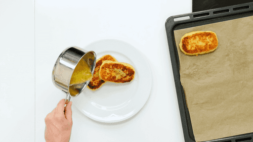 Подготовленный полуфабрикат положить на разогретый с жиром противень, обжарить с обеих сторон и довести до готовности в жарочном шкафу.