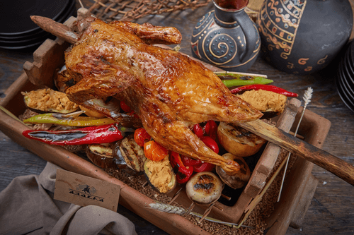Утка по-грузински — это кулинарное воплощение грузинского гостеприимства и богатых вкусов. Это блюдо сочетает нежное, маринованное мясо с пряными специями, ароматной красной аджикой и сочной грибной начинкой. Маринование утки в смеси лимона, соли, сахара и грузинских специй придает ей особую мягкость и насыщенный вкус. Вешенки, тушенные в белом вине с луком и чесноком, добавляют нежную текстуру и изысканную глубину вкуса. Запеченная до золотистой корочки утка становится украшением стола, пропитывая воздух чарующими ароматами кавказской кухни. Идеально подходит для праздничного ужина или семейного застолья, это блюдо раскрывает грузинские традиции через искусное сочетание вкусов и методов приготовления.