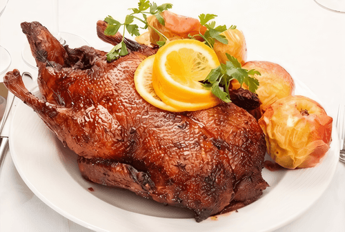 Гусь, фаршированный яблоками, брусникой и черносливом, — это настоящее праздничное блюдо русской кухни, укорененное в традициях и передаваемое из поколения в поколение. Маринованный в гранатовом соке с горчицей и ароматными специями, он приобретает насыщенный вкус и нежность. Сочетание кислых яблок, терпкой брусники и сладкого чернослива создаёт богатую палитру вкусов, в которой сладость и кислинка идеально сбалансированы. Запечённый до золотистой корочки, он становится ароматным и сочным, радуя глаз и пробуждая аппетит. Это блюдо подают на особые события, такие как Рождество или семейные торжества, украшая стол и собирая родных и друзей. Гусь не только вкусен, но и символизирует тепло и уют домашнего очага.
