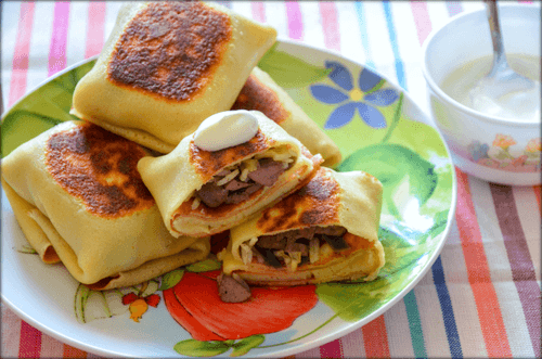 Накладывать начинку на поджаренную сторону блинчиков и сворачивать их конвертами. Затем обжарить блинчики на растительном масле.