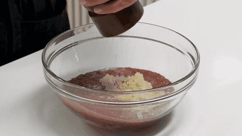 Выложить лук к фаршу, стараясь отцеживать масло. Посолить, поперчить.