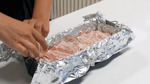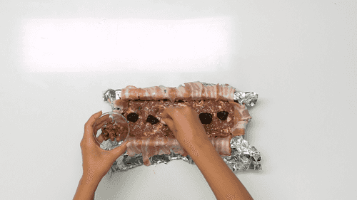 Застелить форму для запекания фольгой, чтобы края свисали. Выложить внахлест бекон, края тоже должны свисать.