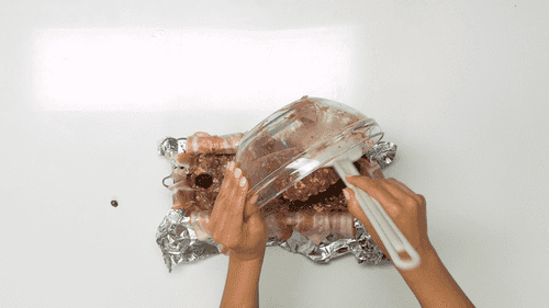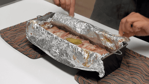 Террин полностью завернуть в фольгу и поставить в духовку, разогретую до 190 градусов, на 1 час. Снять крышку фольги и подержать в духовке еще 30 минут.