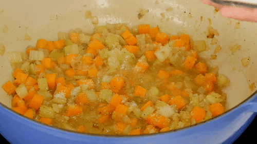 В ту же сковороду бросить нарезанные средним кубиком лук, морковь и сельдерей.