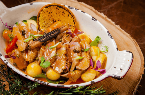 Спайси-грудка гамадари – это изысканное блюдо китайской кухни, объединяющее пряные и свежие оттенки вкуса. Истоки этого рецепта лежат в традиционных китайских техниках обжаривания мяса с ароматными приправами и соусами. Утиная грудка, приготовленная до сочности, обогащается теплом корня сельдерея, моркови и топленого масла, а затем дополняется свежестью апельсинового сока и пикантностью перца чили. Соевый соус гамадари придает блюду насыщенный умами-акцент, а легкая карамелизация в коньяке раскрывает глубину вкусовых оттенков. Завершающий штрих – аромат корицы, который делает подачу поистине атмосферной. Это блюдо идеально подходит для ужина в восточном стиле, поражая балансом пряностей и легкой сладости.