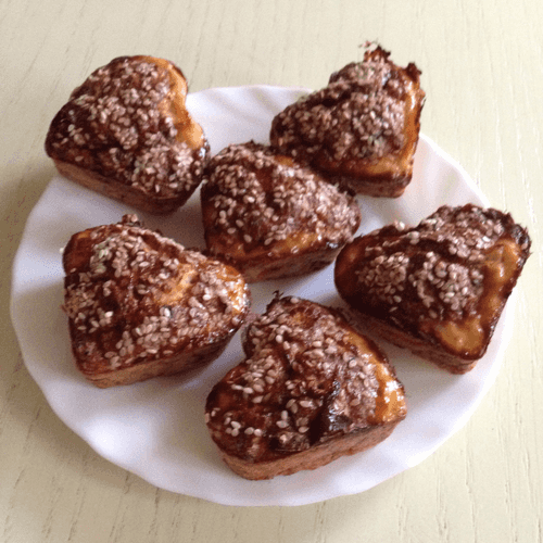 Разложить по силиконовым формам, посыпать кунжутом и запекать в разогретой до 190°C духовке около 40 минут.