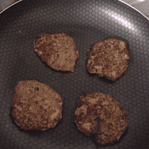 Выкладывать тесто ложкой на разогретую сковороду (по 1 ст. л. на шутку, 4 штуки за раз) и жарить на среднем огне по несколько минут (не дольше!) с обеих сторон до румяной корочки.