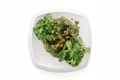 Брокколи в азиатском стиле с булгуром и кедровыми орехами кимчи