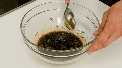 Смешать наршараб, мелко нарезанную мяту, кинзу, сок одного лайма, чайную ложку лимонного сока, рыбный соус и уксус.