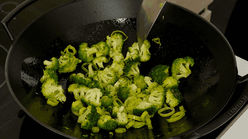 Разогреть вок, влить масло для жарки, бросить брокколи и кольца порея. Постоянно помешивать, спустя 2 минуты влить 20 мл воды, добавить соус из наршараба и жарить на сильном огне еще 30-40 секунд.